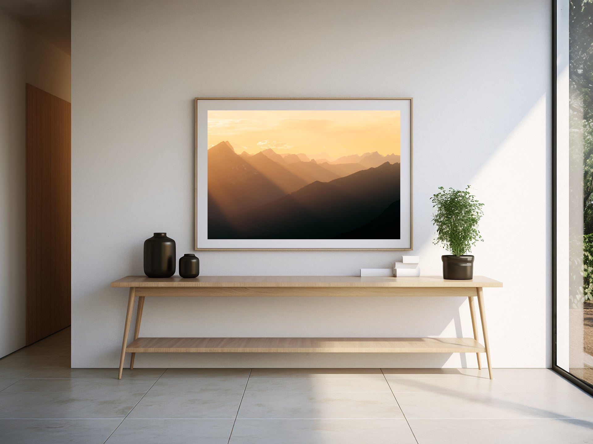 Frames: Available in black, white and natural wood finish. The images found on our product page are mockups. Each natural wood frame will differ slightly in the color and grain pattern. Each frame is handcrafted with a sheet of UV-blocking acrylic glass and comes fully assembled and ready to hang by wire on your wall.
