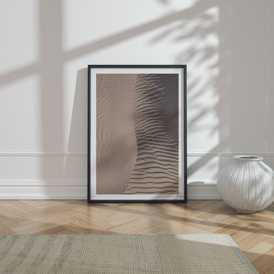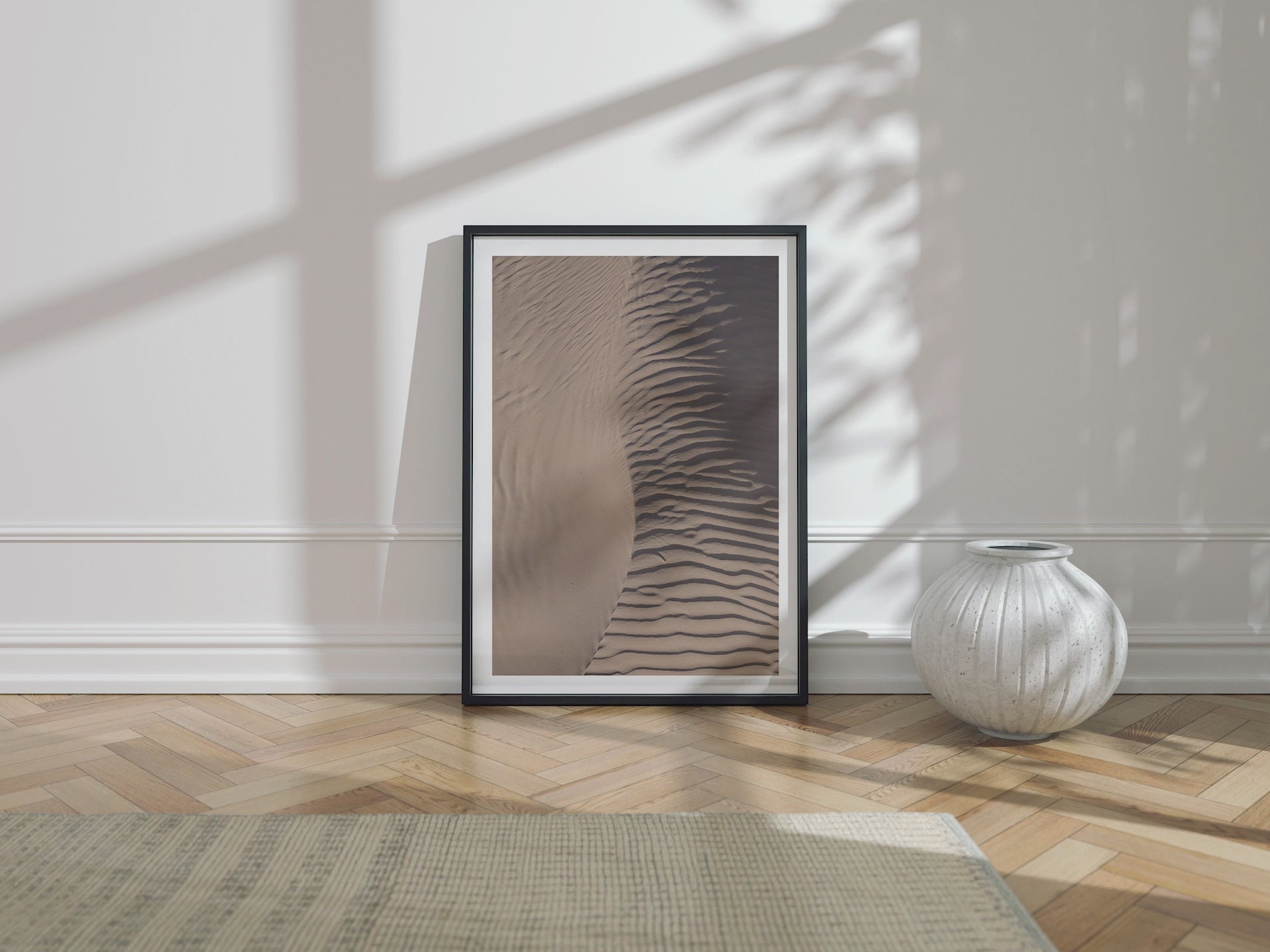 Frames: Available in black, white and natural wood finish. The images found on our product page are mockups. Each natural wood frame will differ slightly in the color and grain pattern. Each frame is handcrafted with a sheet of UV-blocking acrylic glass and comes fully assembled and ready to hang by wire on your wall.