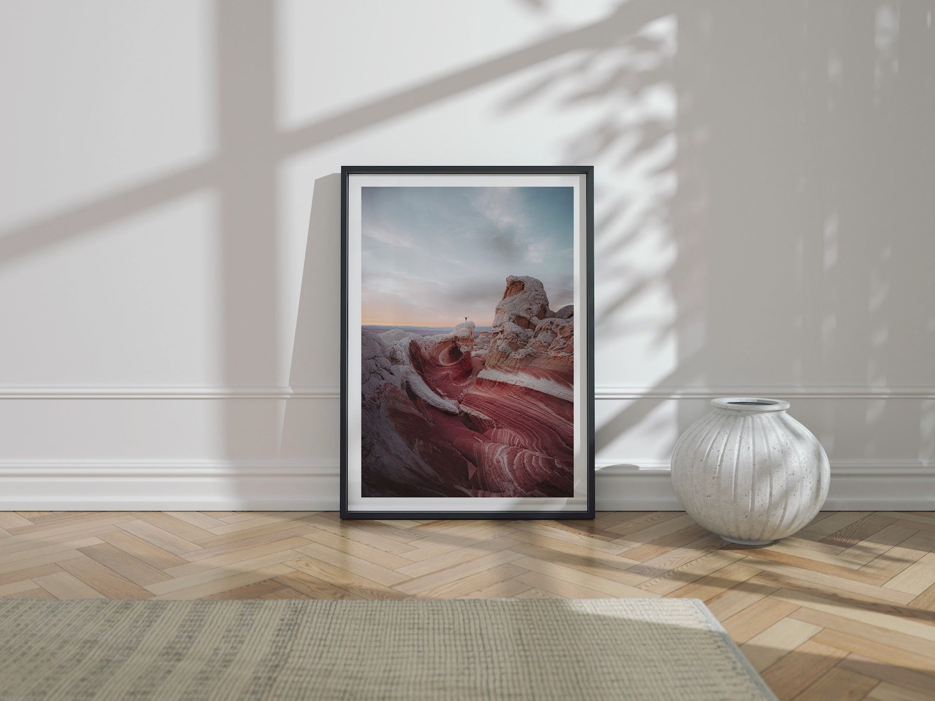 Frames: Available in black, white and natural wood finish. The images found on our product page are mockups. Each natural wood frame will differ slightly in the color and grain pattern. Each frame is handcrafted with a sheet of UV-blocking acrylic glass and comes fully assembled and ready to hang by wire on your wall.