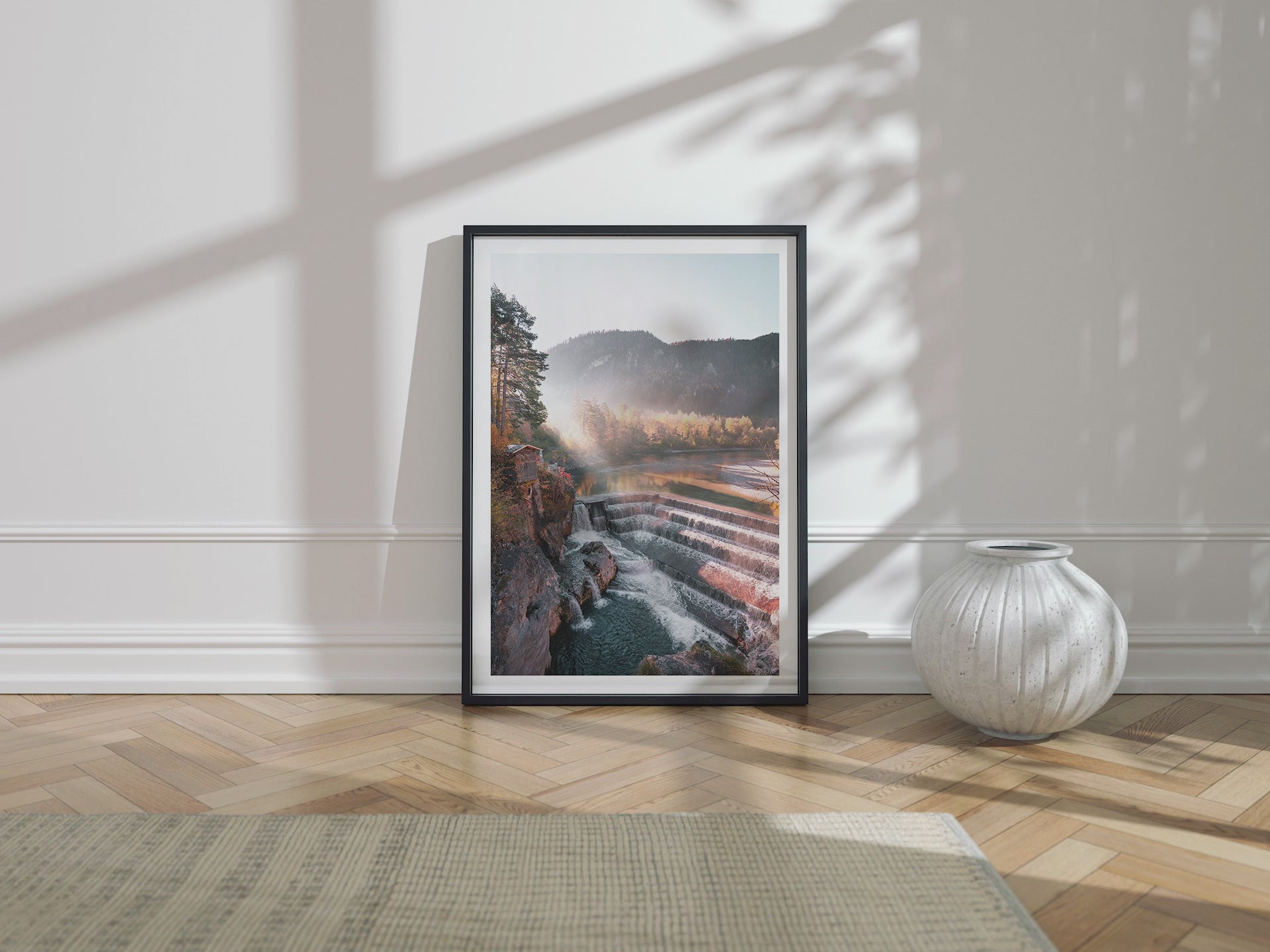 Frames: Available in black, white and natural wood finish. The images found on our product page are mockups. Each natural wood frame will differ slightly in the color and grain pattern. Each frame is handcrafted with a sheet of UV-blocking acrylic glass and comes fully assembled and ready to hang by wire on your wall.