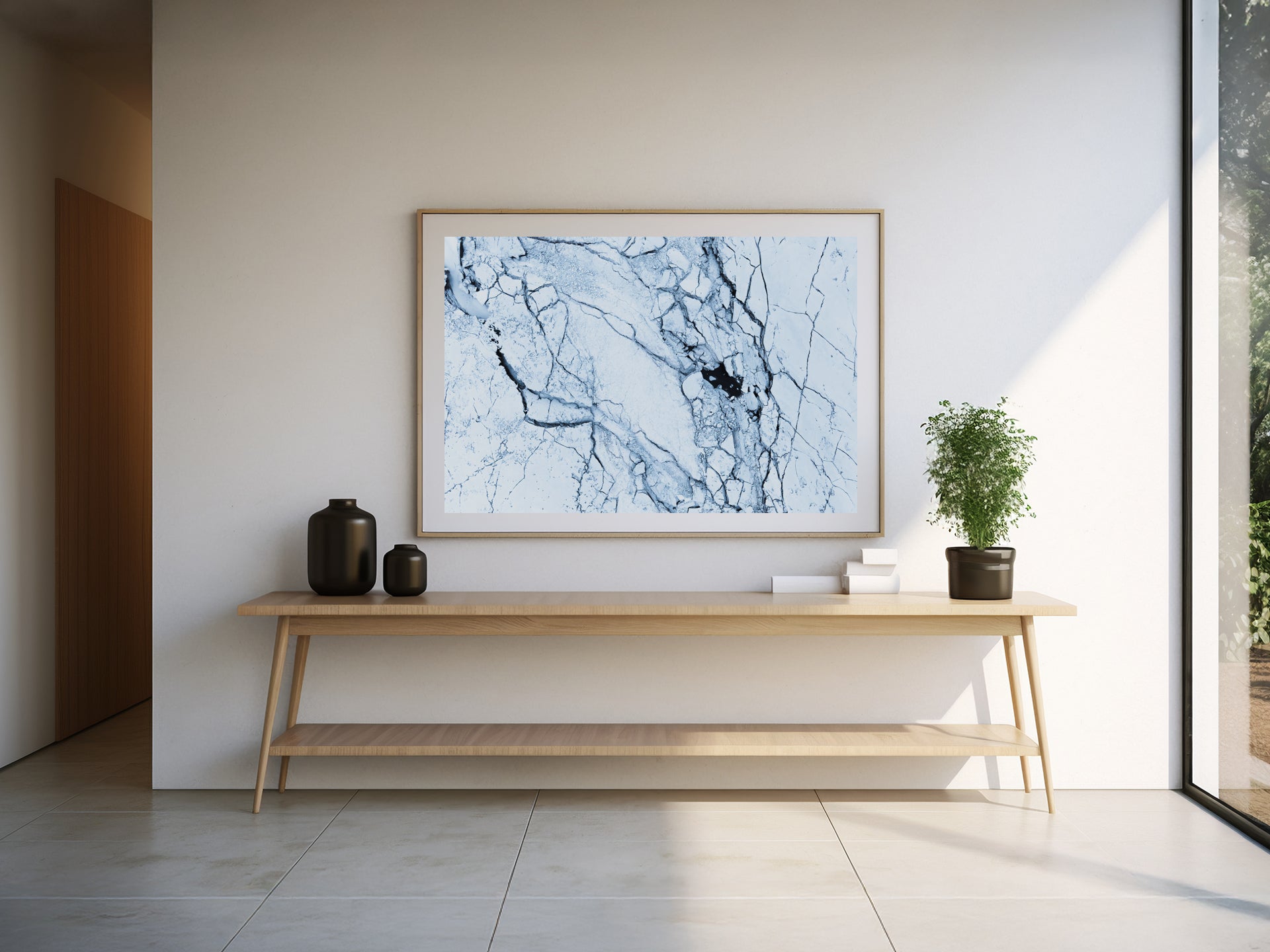 Frames: Available in black, white and natural wood finish. The images found on our product page are mockups. Each natural wood frame will differ slightly in the color and grain pattern. Each frame is handcrafted with a sheet of UV-blocking acrylic glass and comes fully assembled and ready to hang by wire on your wall.