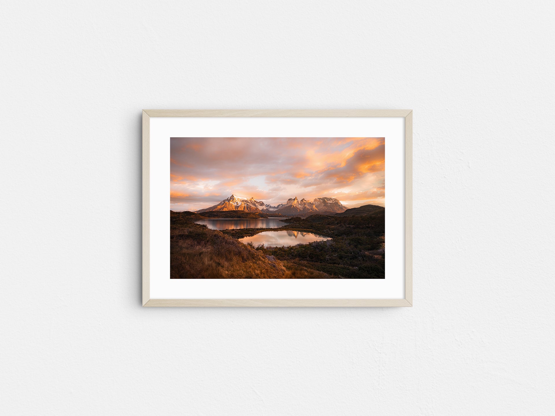 Frames: Available in black, white and natural wood finish. The images found on our product page are mockups. Each natural wood frame will differ slightly in the color and grain pattern. Each frame is handcrafted with a sheet of UV-blocking acrylic glass and comes fully assembled and ready to hang by wire on your wall.