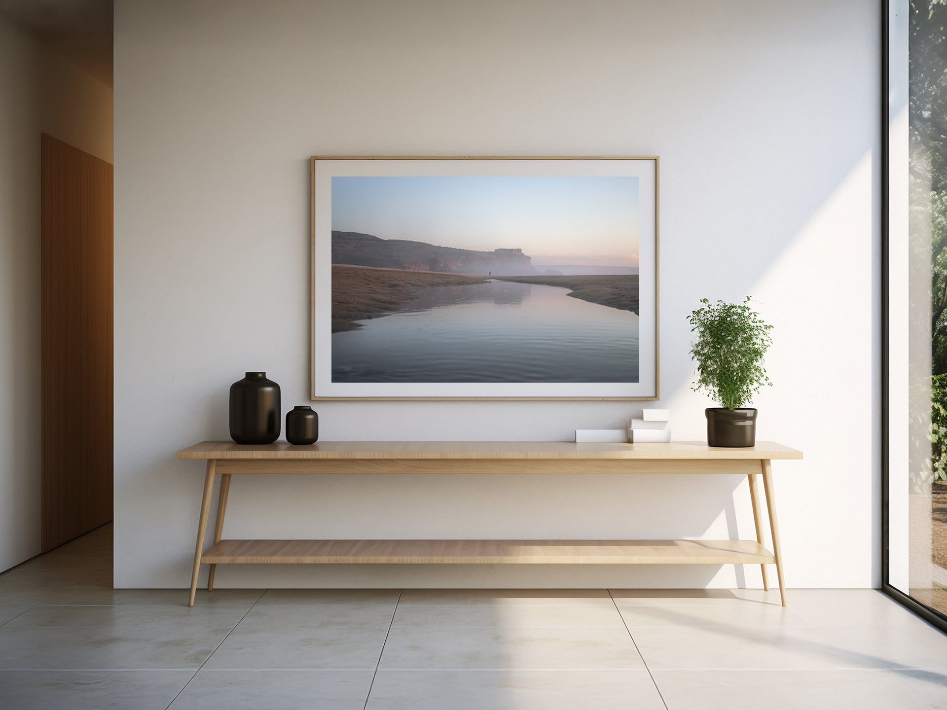 Frames: Available in black, white and natural wood finish. The images found on our product page are mockups. Each natural wood frame will differ slightly in the color and grain pattern. Each frame is handcrafted with a sheet of UV-blocking acrylic glass and comes fully assembled and ready to hang by wire on your wall.