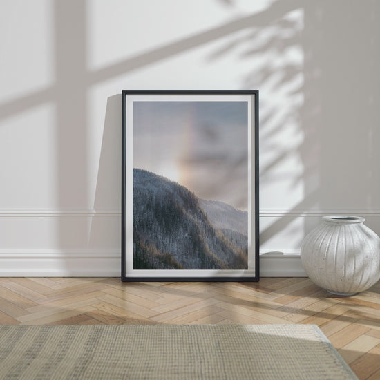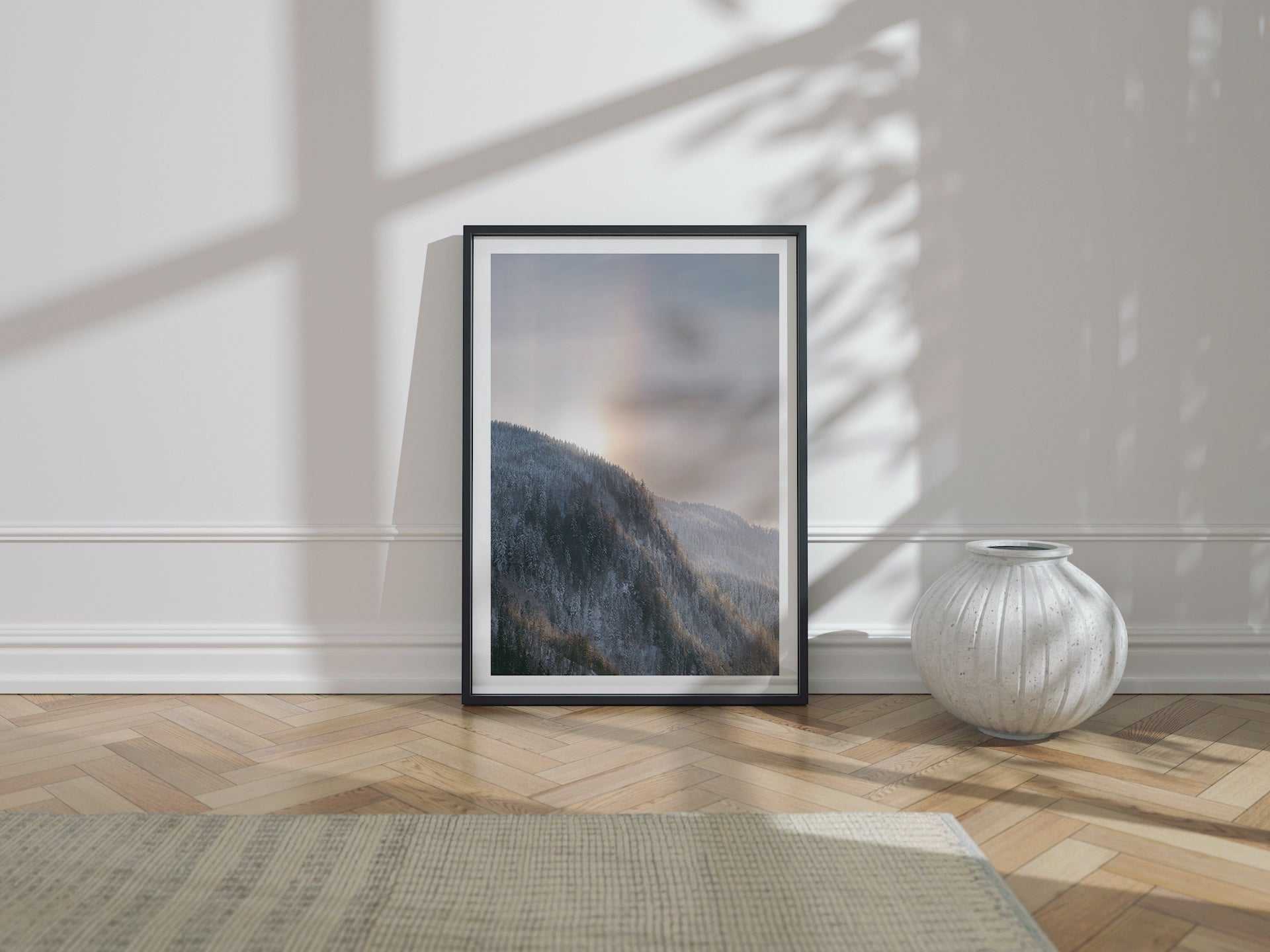 Frames: Available in black, white and natural wood finish. The images found on our product page are mockups. Each natural wood frame will differ slightly in the color and grain pattern. Each frame is handcrafted with a sheet of UV-blocking acrylic glass and comes fully assembled and ready to hang by wire on your wall.