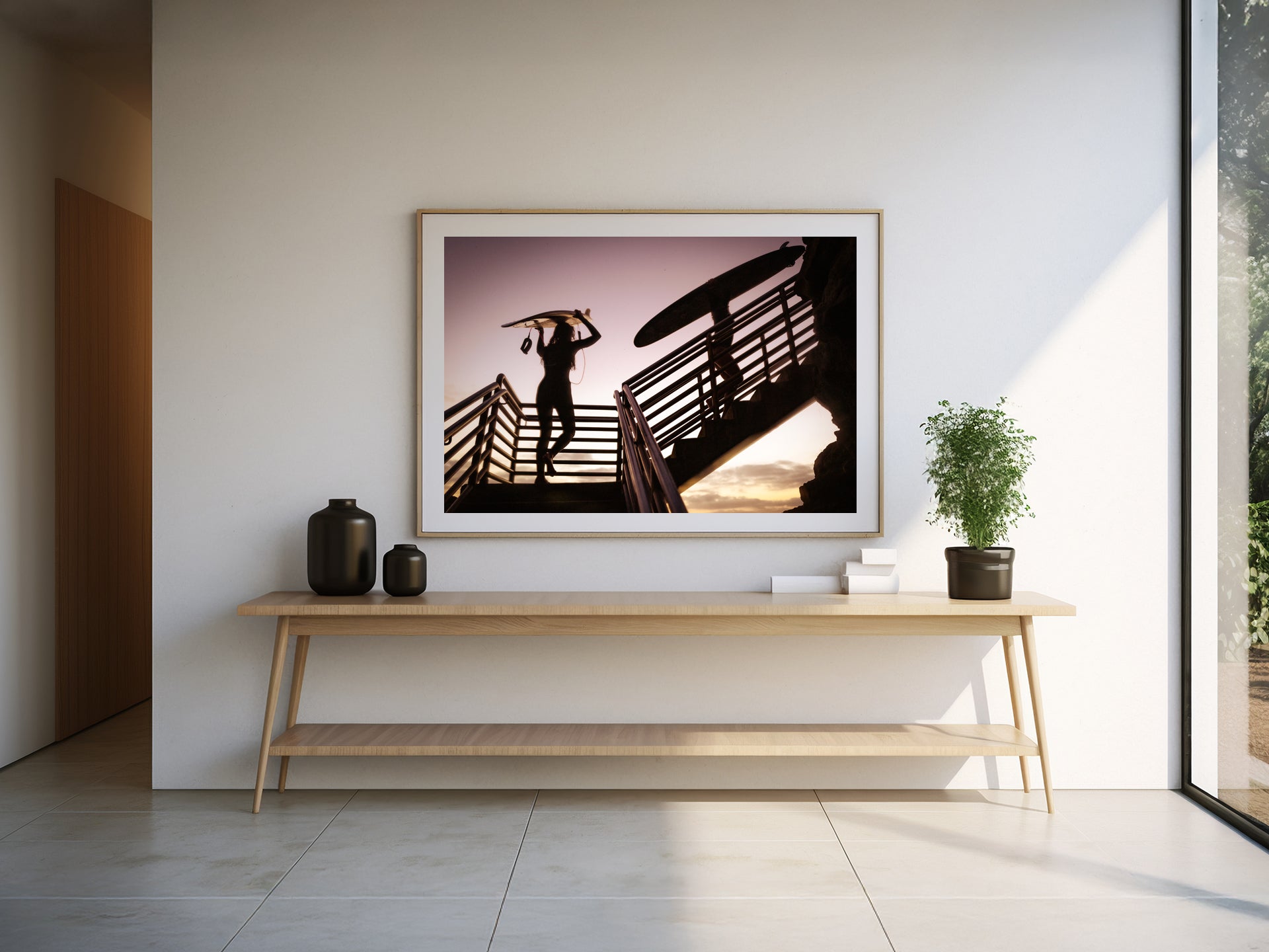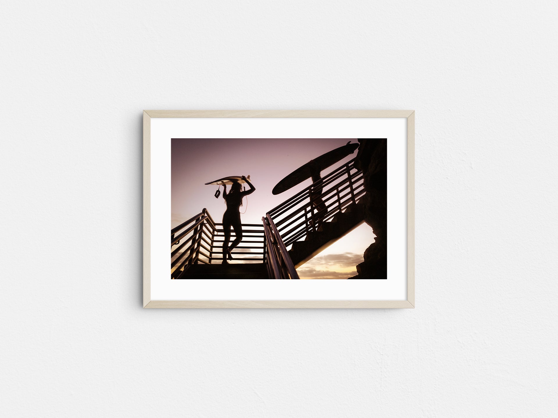 Frames: Available in black, white and natural wood finish. The images found on our product page are mockups. Each natural wood frame will differ slightly in the color and grain pattern. Each frame is handcrafted with a sheet of UV-blocking acrylic glass and comes fully assembled and ready to hang by wire on your wall.
