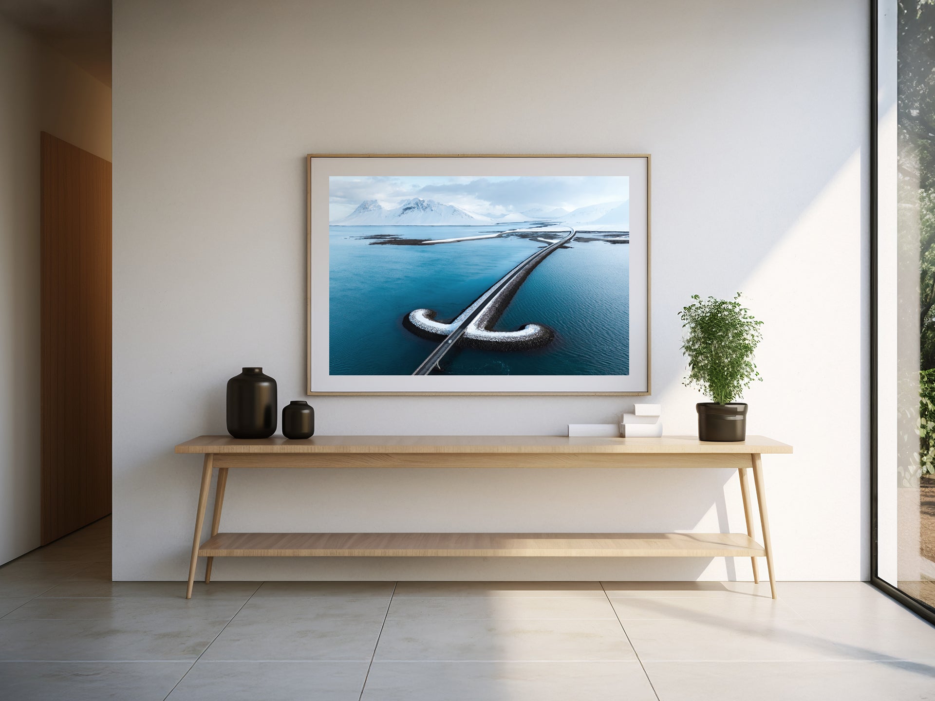 Frames: Available in black, white and natural wood finish. The images found on our product page are mockups. Each natural wood frame will differ slightly in the color and grain pattern. Each frame is handcrafted with a sheet of UV-blocking acrylic glass and comes fully assembled and ready to hang by wire on your wall.