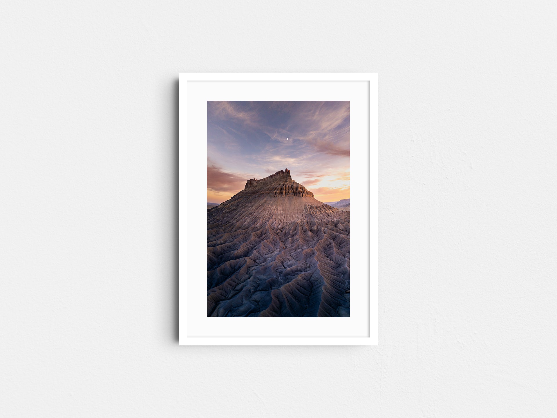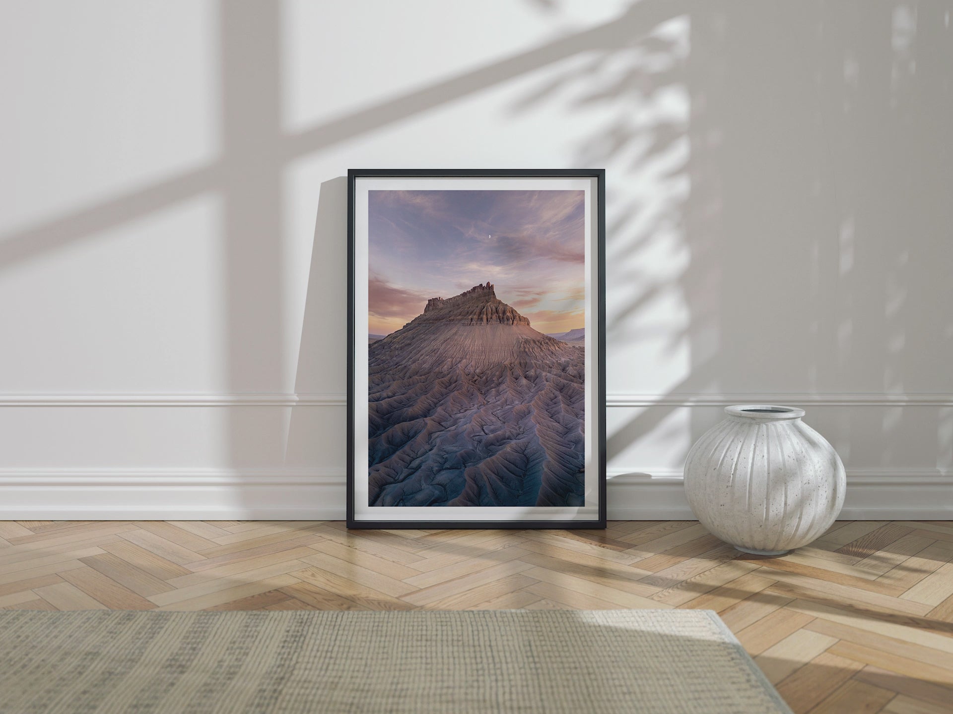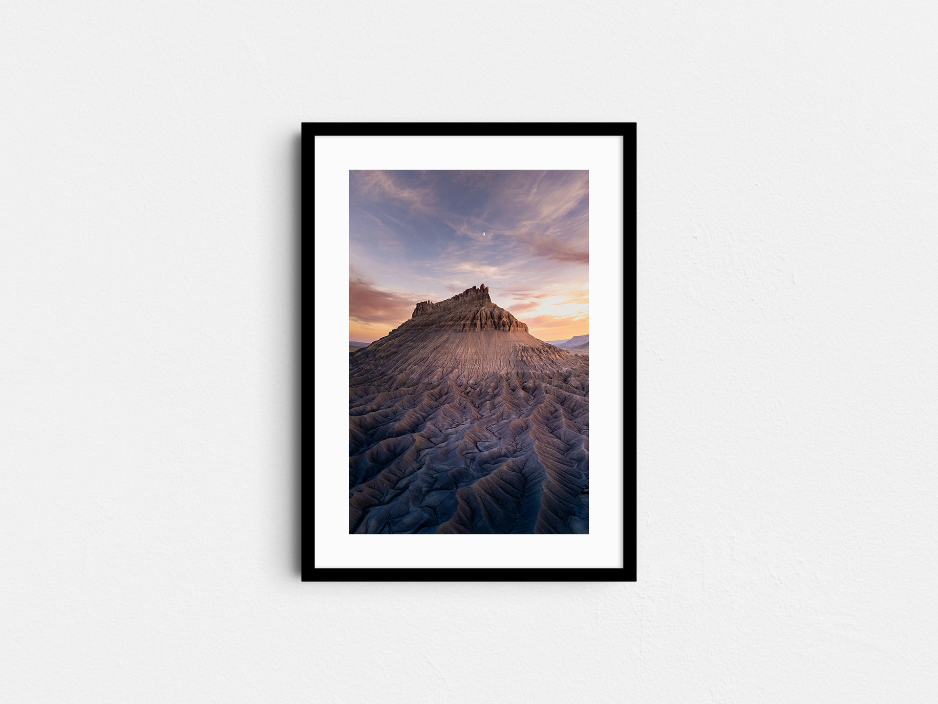 Frames: Available in black, white and natural wood finish. The images found on our product page are mockups. Each natural wood frame will differ slightly in the color and grain pattern. Each frame is handcrafted with a sheet of UV-blocking acrylic glass and comes fully assembled and ready to hang by wire on your wall.