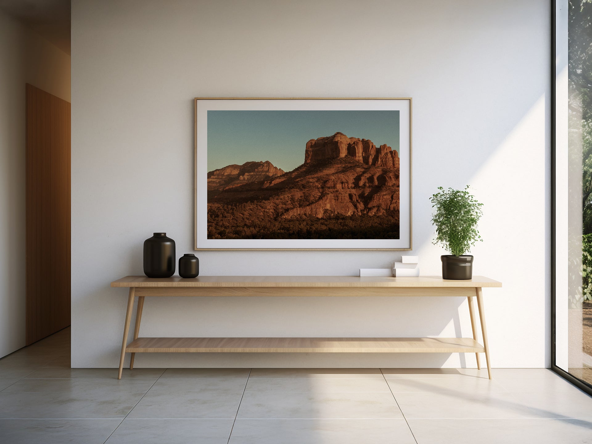 Frames: Available in black, white and natural wood finish. The images found on our product page are mockups. Each natural wood frame will differ slightly in the color and grain pattern. Each frame is handcrafted with a sheet of UV-blocking acrylic glass and comes fully assembled and ready to hang by wire on your wall.
